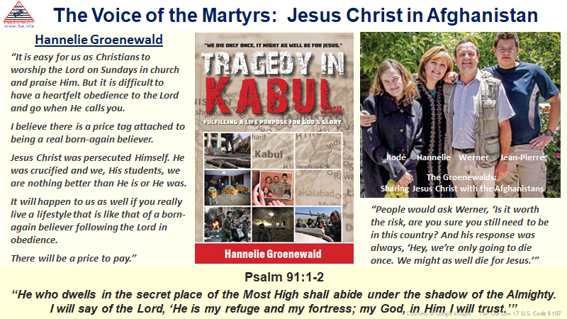 Hannelie Groenewald, a medical doctor from South Africa, was a missionary in Afghanistan with her family when in 2014 the Taliban killed her husband and two children. Fearless service to Christ had been a theme for Werner, the husband. A month before his death, Werner spoke at a conference on the subject of ‘Counting the Cost for Christ’. He ended it by saying, “We die only once. We might as well die for Jesus.”