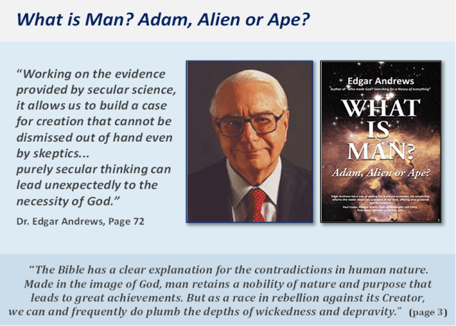 Second, applying the Socratic Method. In his latest book “What is Man? Adam, Alien or Ape?”, Dr. Andrews presents the issues associated with the origin and nature of man, both in terms of mankind as a living being and as a unique creature from all other life forms, presenting us with 153 provocative questions about mankind and then providing the best answers (not rhetoric) using the scientific evidences. And third, his communication style is simple and concise. Whether you are a teenager or an adult, a pastor trying to grow in apologetics or a seasoned scientist, Dr. Andrews will speak to you..
